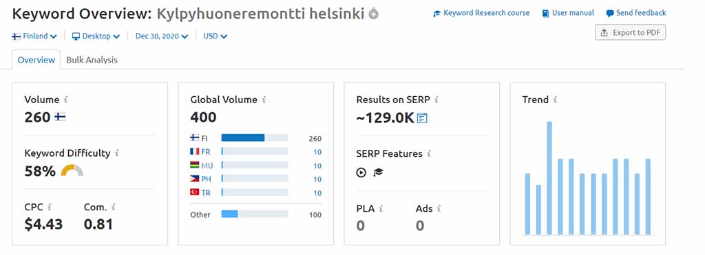 Yllä olevassa tapauksessa on haettu remonttifirmalle avaintermistöä ja tutkittu ”kylpyhuoneremontti helsinki” termiä. Hakufraasi tuottaa kuukausittain keskiarvolla 260/hakua.