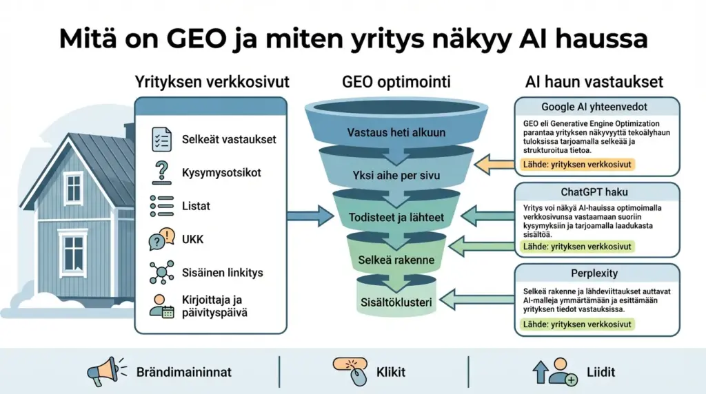 Jos haluat ymmärtää tämän rinnakkaisesti AEO näkökulmasta, lue myös tukisivu sisältörakenteesta: GEO sisältörakenne: miten kirjoitat siteerattavan vastauksen.