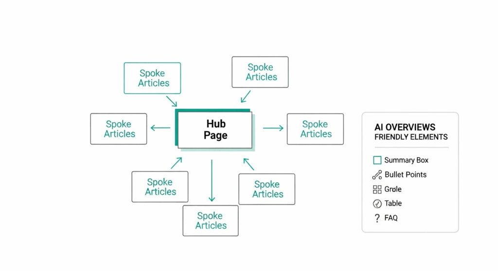 • Rakenna hub ja spoke klustereita. Yksi laaja hub sivu ja useita kohdennettuja spoke artikkeleita, joihin on selkeä sisäinen linkitys.